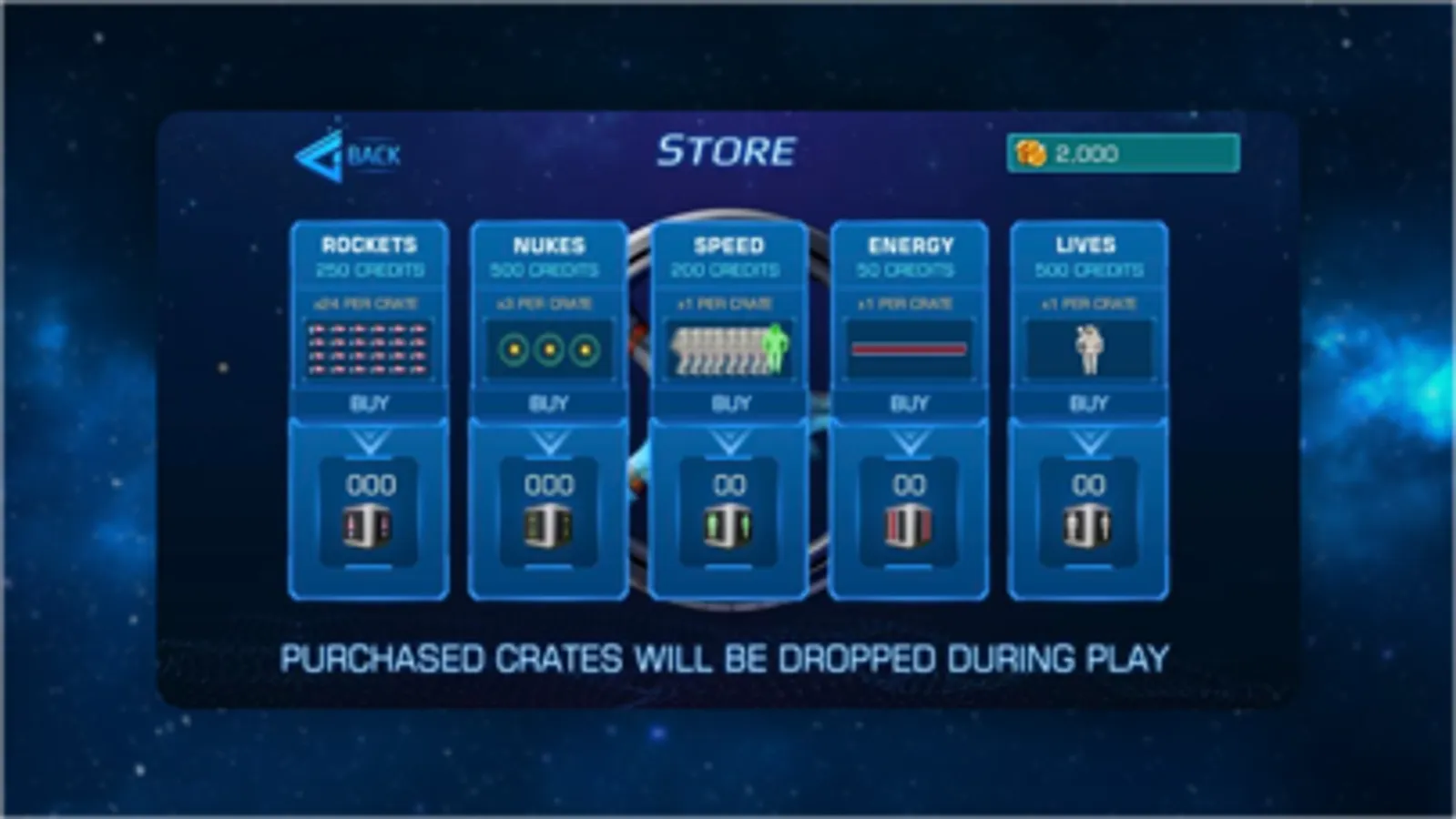 Before you start a game, when game is paused or after each level, you can enter the in-game store and buy weapons and other crates which are loaded into the dropship. The robotic dropship orbits the moon. The ship delivers several crates from its inventory during the level when required.