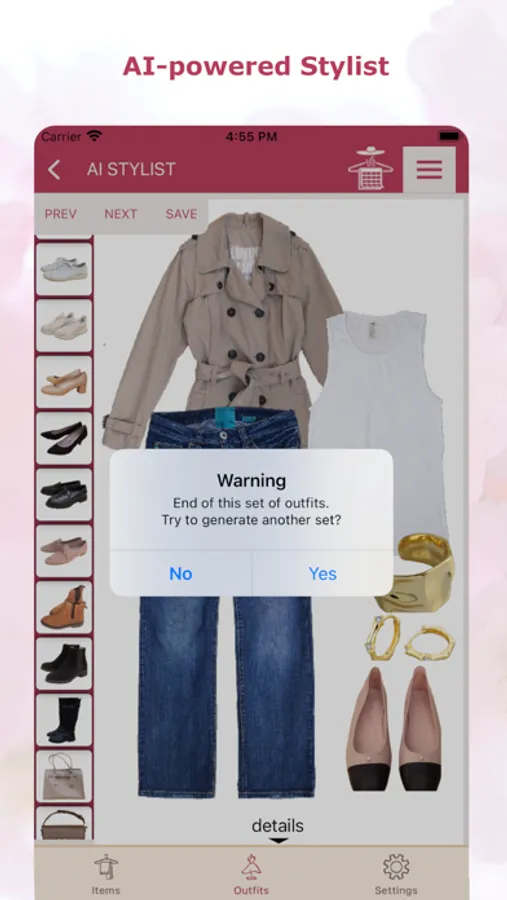Outfits are created either manually or by the AI stylist. The AI stylist is specially designed to follow the principles of colour combining or to choose from a variety of predefined colour schemes. Suggested outfits consist of 1 to 4 pieces and are offered with a selection of accessories, if present. You can edit each AI-generated outfit to make it perfect for your taste.