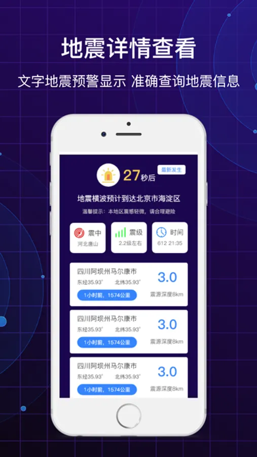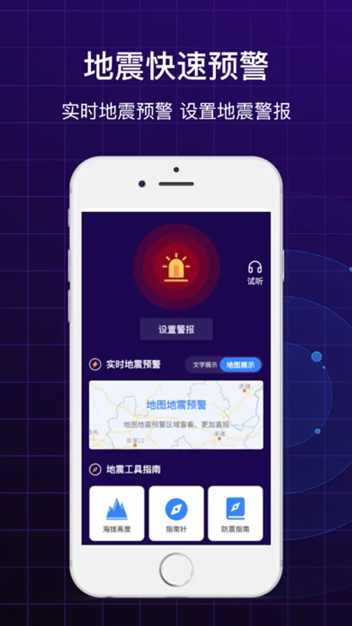 地震预警,多功能多服务;提供预警设置、防震指南、指南针、防震演练等多种应用。