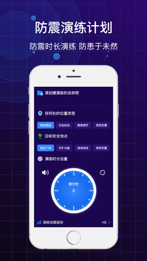 应用程序的特色功能,防震时长演练,防患于未然;支持地理位置、演练时长、方向海拔等多种选择设置,提示音与倒计时便于演练落地。