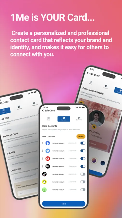 Separate Worktime from Playtime: With 1Me, you can have unlimited number of contact cards. You can choose contact information to be included in each card, and then choose whom you will share each card with. This is best to separate between your business and personal contact information.