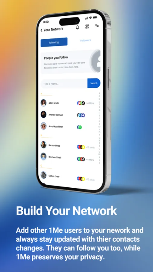 1Me Network: Build your always-updated contacts’ network. If you and your contacts are 1Me users, then you can be added to each other’s network, this will keep each of you updated whenever someone changes contact info. 1Me is always keen on your privacy though, so you will have full control of which contact info you want to share with your network connections. Once your contacts download 1Me, they will always receive updates from you if you change any contact details, like changing work or mobile numbers.