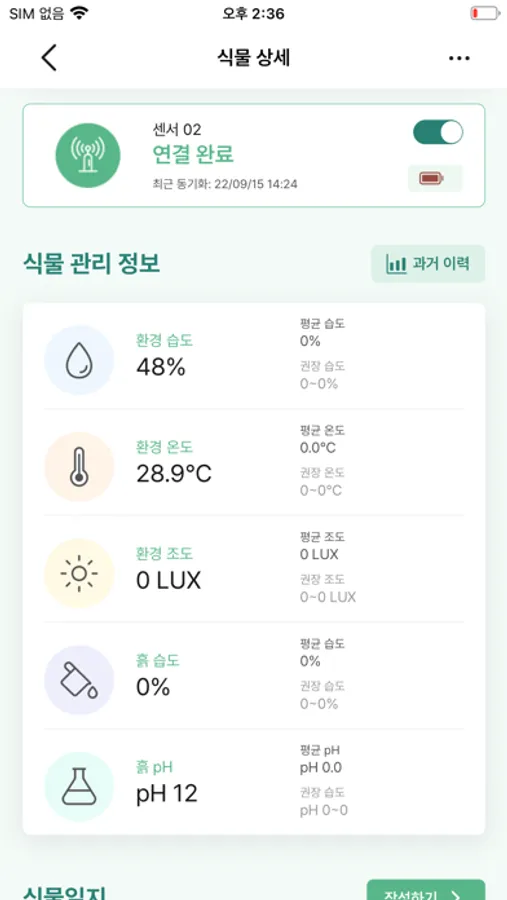 IoT 센서와 연동하여 식물이 있는 환경의 햇빛, 온도, 습도와 식물이 식재된 흙의 수분량과 산성도를 알려줘요.