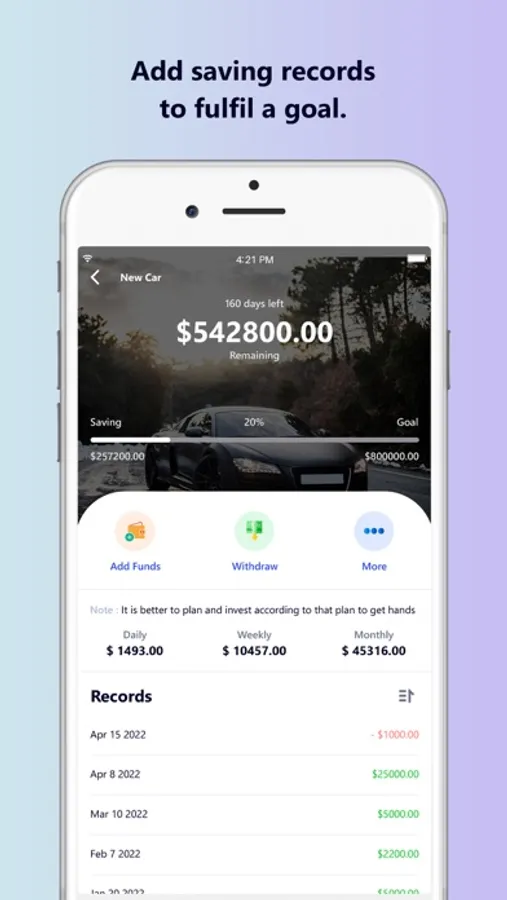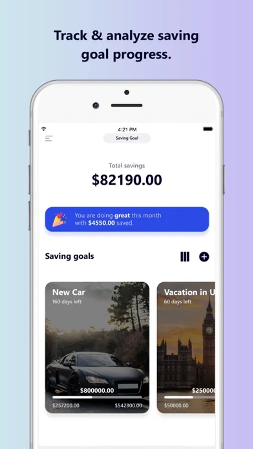 Visualize your savings goal, make it meaningful, and manage your budget and expense. Use this powerful Savings Goal: Piggy Bank app to set your savings goal, build habits in saving money, and track the progress of your goals.