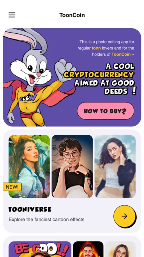 ToonCoin is a fun cartoon maker that smartly combines the useful with the pleasant. This photo editing app has two main functions: it lets everyone create eye-catching toons from their photos and, at the same time, serves as a promo tool for holders of ToonCoin - a game-changing cryptocurrency aimed at good deeds.