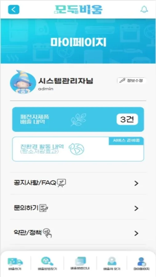 E-순환거버넌스에서 운영하는 페전자제품 배출 플랫폼으로, 사용자가 쉽고 편리하게 폐전자제품을 배출할 수 있도록 안내하고 관련 서비스로 연결해주는 앱입니다.