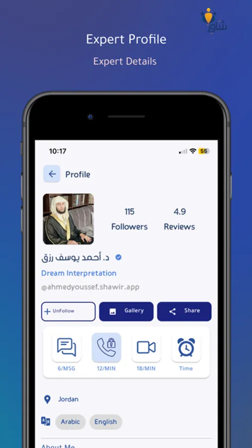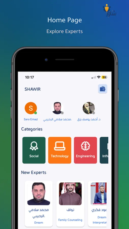 Shawir is an online platform that connects customers with experts, celebrities, and influencers worldwide. Shawir counsellors specialize in marriage and family counseling, marital relationships, interpretation of dreams, psychological, nutrition, physiognomy, personality analysis, technology, health, and diet. We welcome experienced advisors, counsellors, celebrities, and influencers to join this platform.