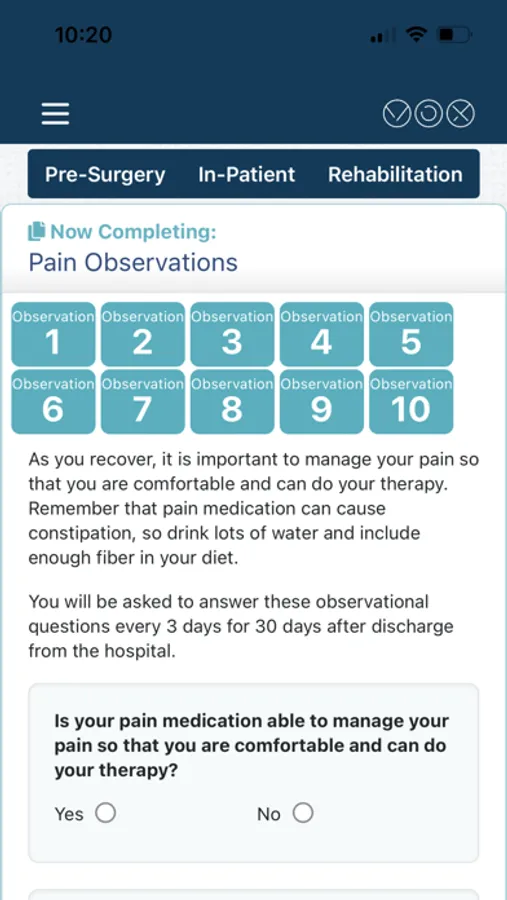 Stay connected by logging in throughout your recovery to answer the observation questions about your progress and symptoms, which will help you know what to do when you need it most.