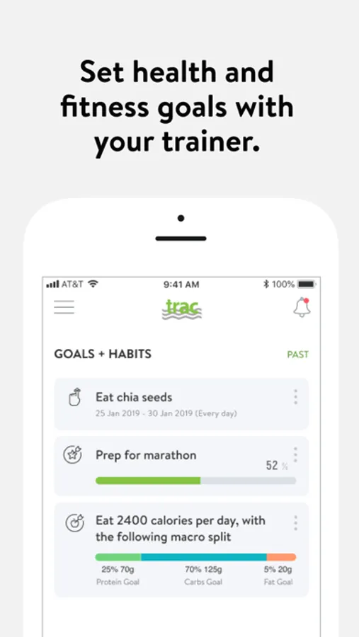With the TRAC Connect App, you can start tracking your workouts and meals, measuring results, and achieving your fitness goals, all with the help of your personal trainer.