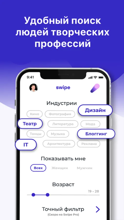 Swipe это сообщество людей креативных индустрий. Используйте удобные фильтры поиска и находите людей творческий профессий для создания деловых связей и общения!