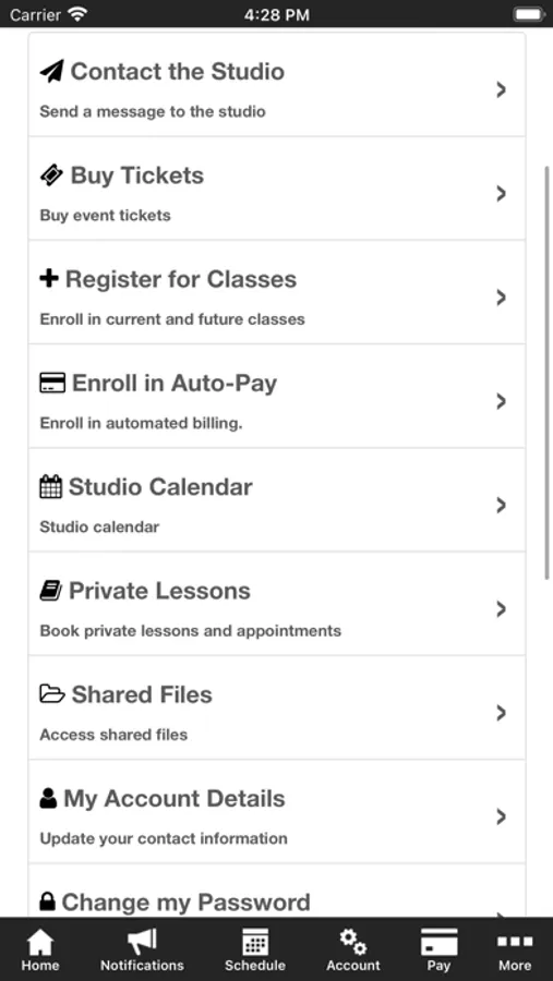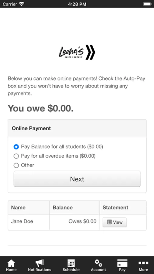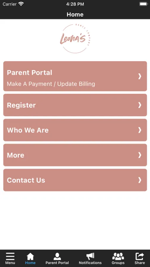 The Leona's Dance app allows you to manage your account with ease, register for classes, pay monthly tuition and fees, and gain access to video's. You'll also receive important notifications about class changes, cancellations, registration openings, special announcements, and upcoming events.