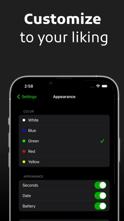 • Fully customizable digital clock face appearance: Seconds, Date, Battery Percentage, Color — you name it.
