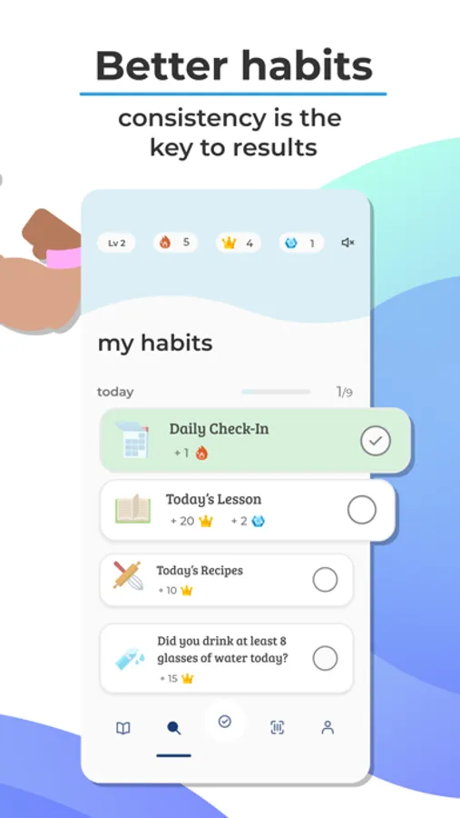 - Habit tracker software to help you consistently engage with your Program and Goals, powered by your personalized algorithm.
