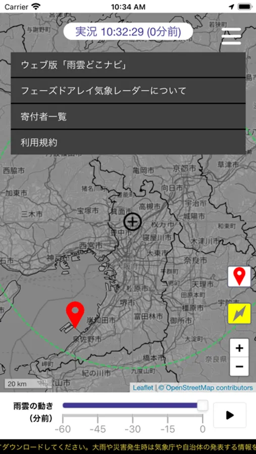 観測範囲は大阪大学吹田キャンパスから半径 60 km以内 (一部対象外の地域あり) です。
