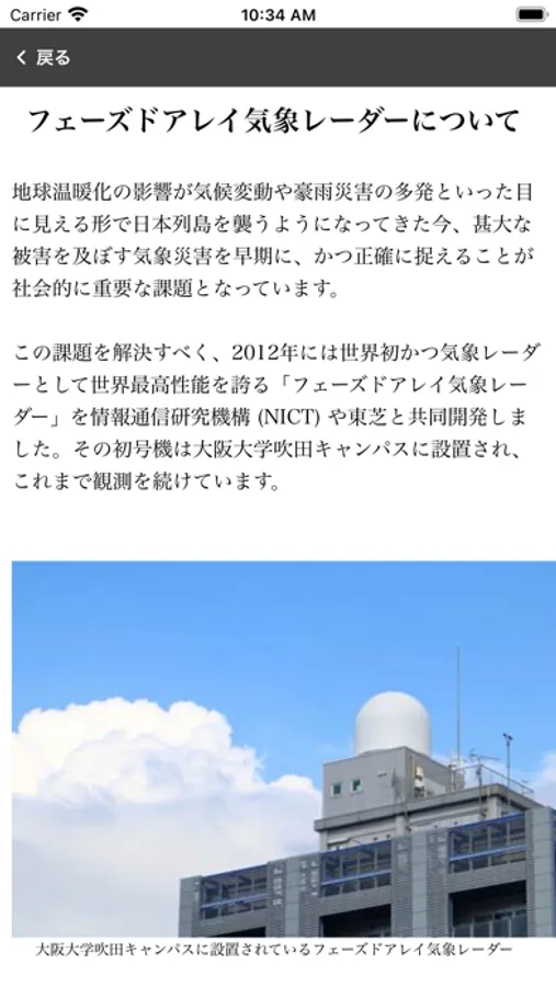 大阪大学吹田キャンパス (大阪府吹田市) に設置されている「フェーズドアレイ気象レーダー」 (国立研究開発法人情報通信研究機構と株式会社東芝との共同開発) で観測した雨雲の様子をリアルタイム配信します。
