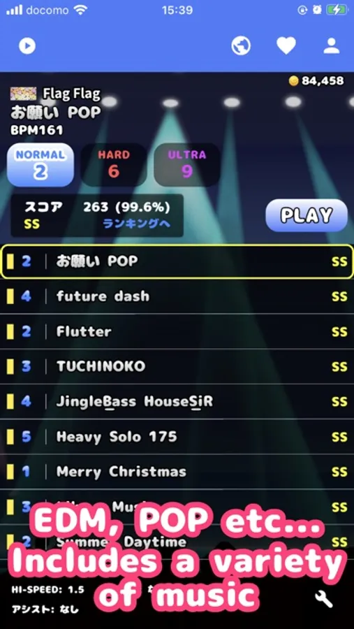 Three difficulty levels are available for each song. Beginners can play on NORMAL, those who are a little more experienced can play on HARD, and advanced players can play on ULTRA.