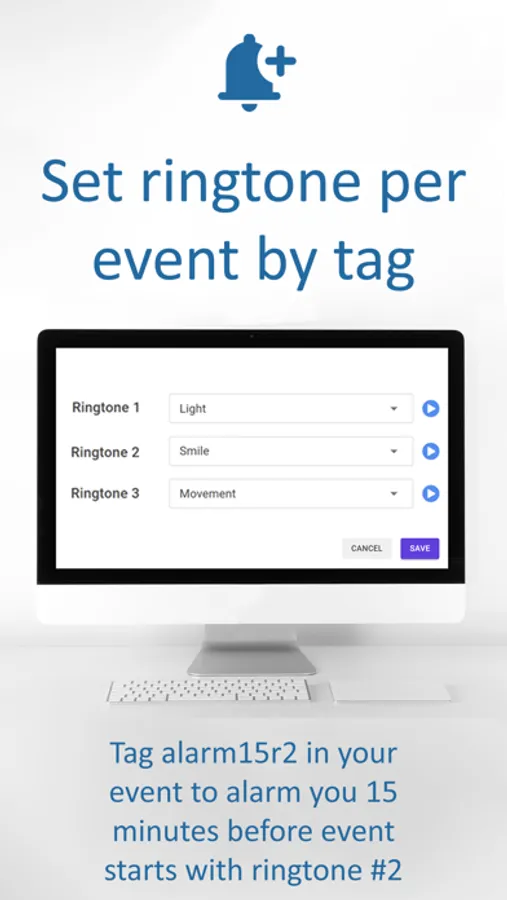 The alarm tag will ring an alarm ringtone music that can be dismissed or snoozed, while the notify tag will ring a short notification tone. You can mix and match multiple tags: up to 3 alarm tags and 3 notify tags per event. Never miss that important meeting again!
