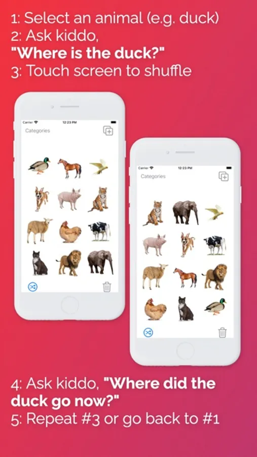 "REX", short for "Receptive Expressive ID (identification)", is a purpose-built app intended for use between an adult (parent, teacher, therapist, etc.) and a client (kiddo, student, patient, etc.). REX is a digital substitute for expensive flashcards that cost hundreds of dollars. Not to mention, you will eliminate hours of time-consuming materials preparation. For example, you can select a visual category (e.g. - actions, animals, colors, common items, community helpers, food, furniture, numbers, etc.) and easily customize your visual collection from one up to twelve subjects. There is a built in shuffle button designed to randomly scramble your custom visual collection testing your client's ability to track and follow. For Receptive Identification, REX will challenge your client to visually identify the subject you verbally call out. For Expressive Identification, REX will challenge your client to verbally identify the subject you visually call out. You can adjust your collection and/or switch categories anytime. Then shuffle and repeat as many iterations is you like.