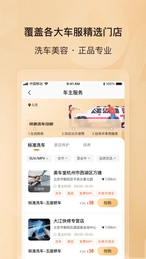 洗车美容五折起,包含内饰清洁、维修保养、全车打蜡、贴膜镀晶等多种专业养车服务,价格透明,一键下单,扫码洗车。