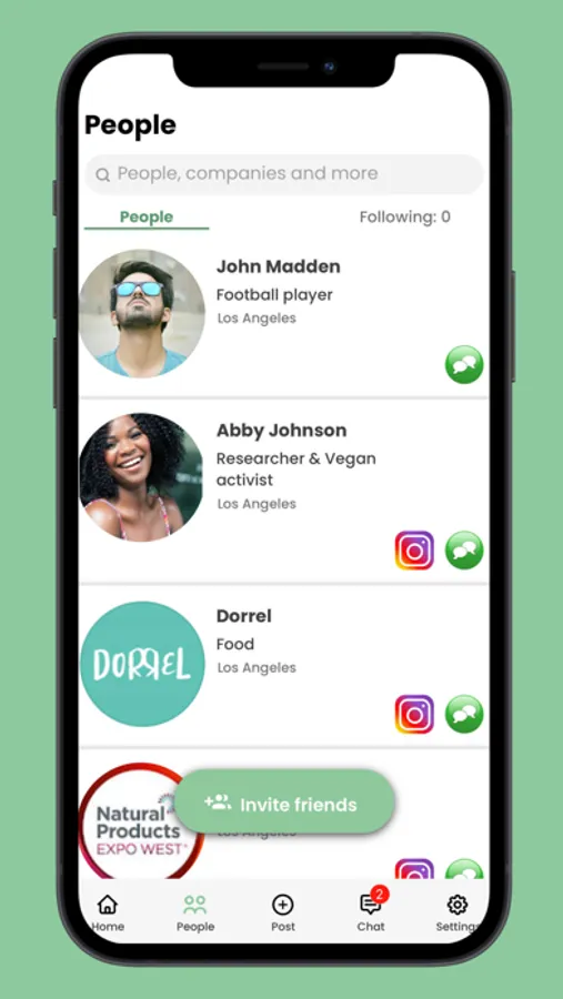 You can find other vegans by location, name, or profession or invite friends to unite the vegan community.