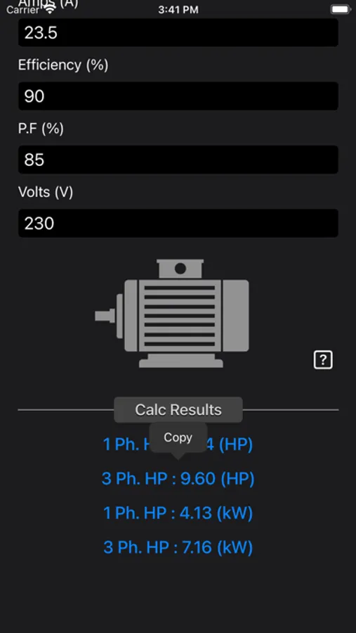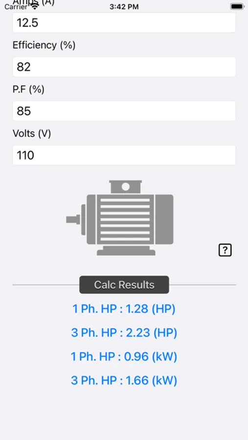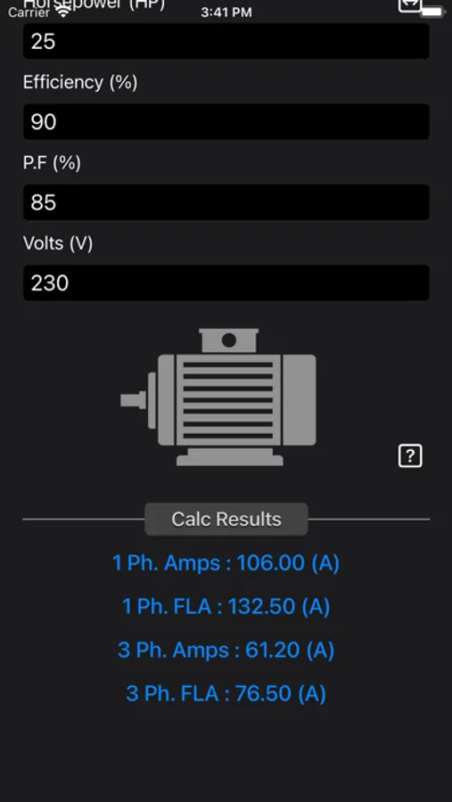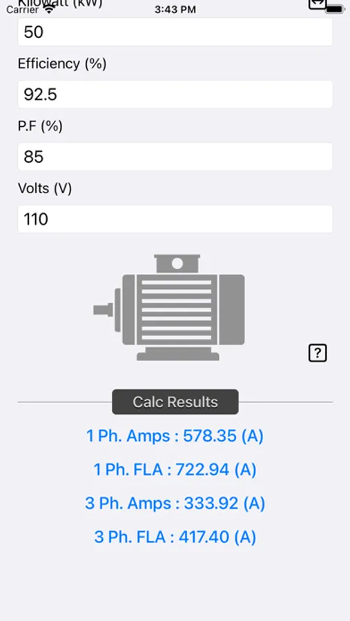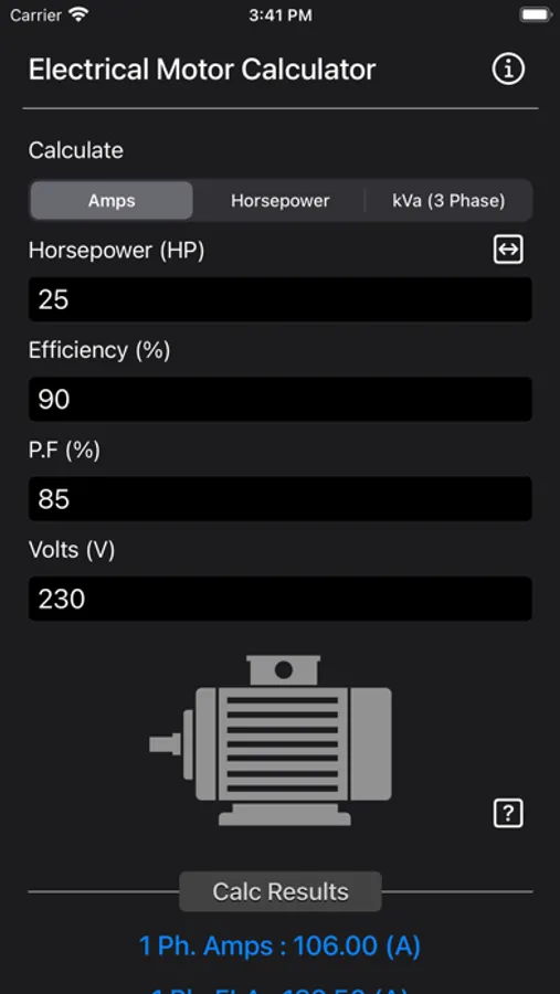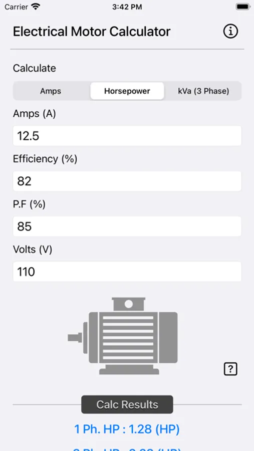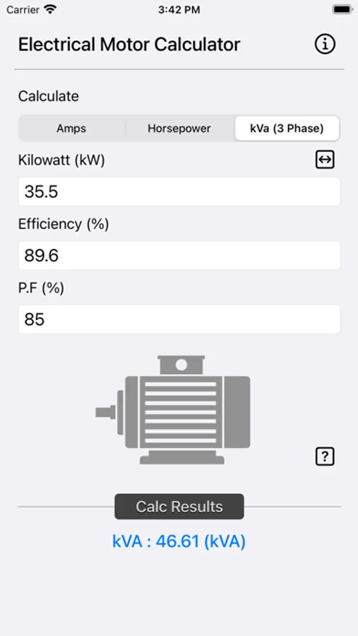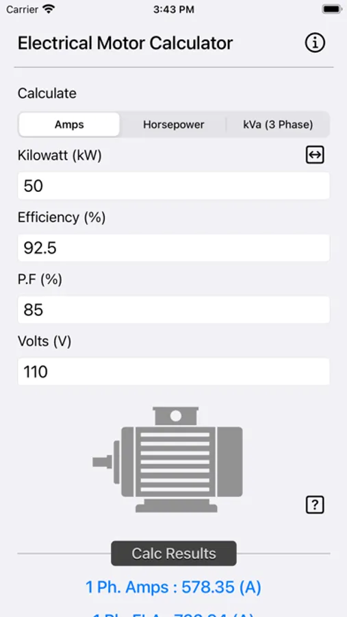 Electrical Motor Calculator lets you figure out electrical characteristics of your system given a specific motor. By inputting horsepower, kilowatt, motor efficiency, power factor, and system voltage the system will calculate the amps, horsepower, kilowatt and kVa.