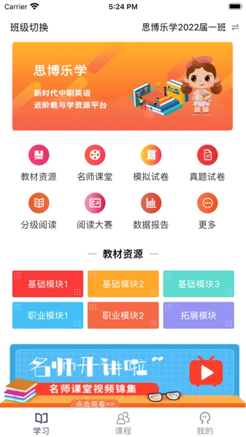 中职英语进阶教与学资源平台围绕特色教学体系及鲜明的选材进行教与学的题型设计,促进学生对内容理解的同时,加强对重要知识点的巩固,从题型、难度、方法上提供大量适应性训练,并配以专家音视频讲解,助力学生英语学习。