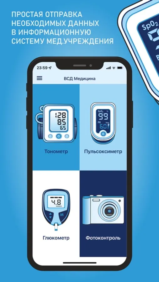 Приложение ВСД.Медицина существенно упрощает взаимодействие пациента с его лечащим врачом, позволяя передавать результаты измерений основных жизненных показателей (давление, пульс, сатурацию, уровень сахара в крови, данные фото наблюдений и т.д.) с измерительных приборов через смартфон пациента непосредственно в информационную систему соответствующего медицинского учреждения.