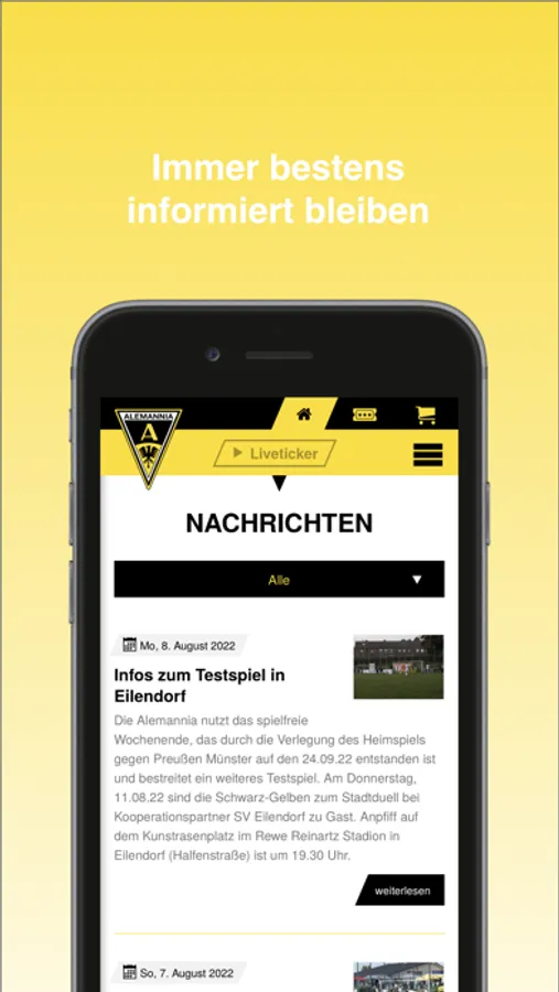 Mit der Alemannia Aachen-App seid ihr rund um die Uhr auf dem neuesten Stand, könnt direkt im Online-Shop ein Trikot oder Schal bestellen, eure Tickets fürs nächste Heimspiel kaufen, in einem Voting für den Spieler des Spiels abstimmen und bekommt per Push-Benachrichtigung auf euren Smartphones immer die Möglichkeit, auf dem neuesten Alemannia-Stand zu sein. Mit einem Klick sind nun alle Infos rund um den Verein direkt auf dem Smartphone oder dem Tablet verfügbar.