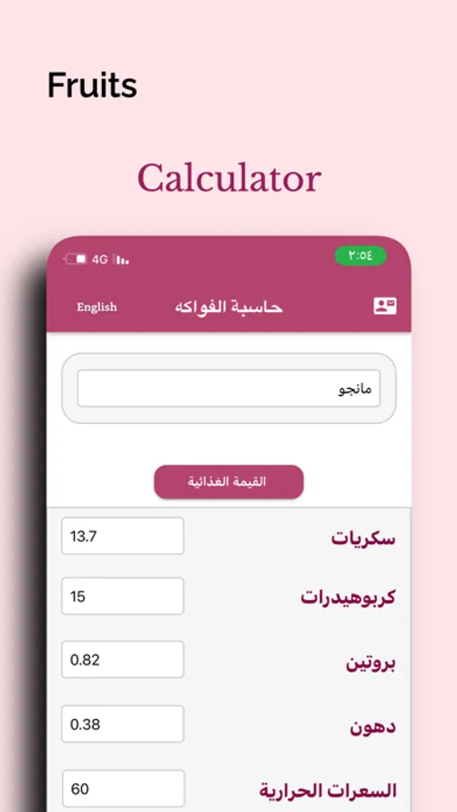 يمكنك من خلال تطبيق حاسبة الفواكه الحصول على القيم الغذائية للفواكه من خلال محرك بحث الفواكه
