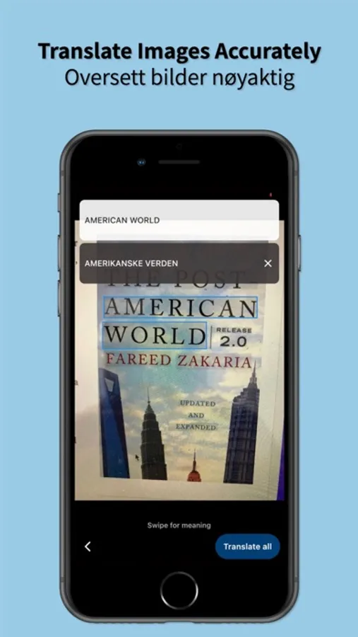 Automatically recognize and translate text in images by taking a photo and pressing a button, can touch a word to know its meaning or see all translated