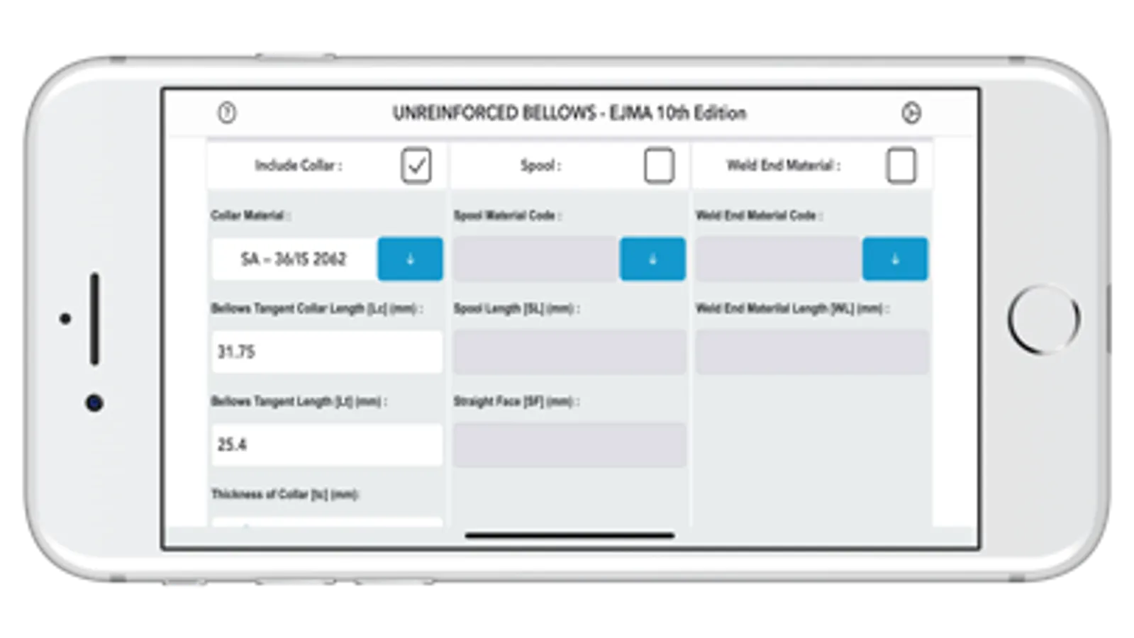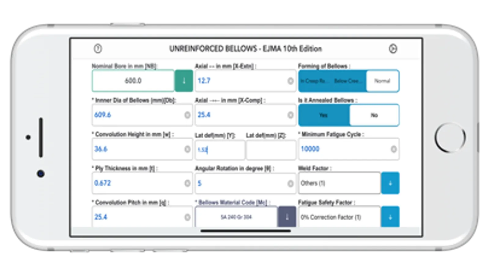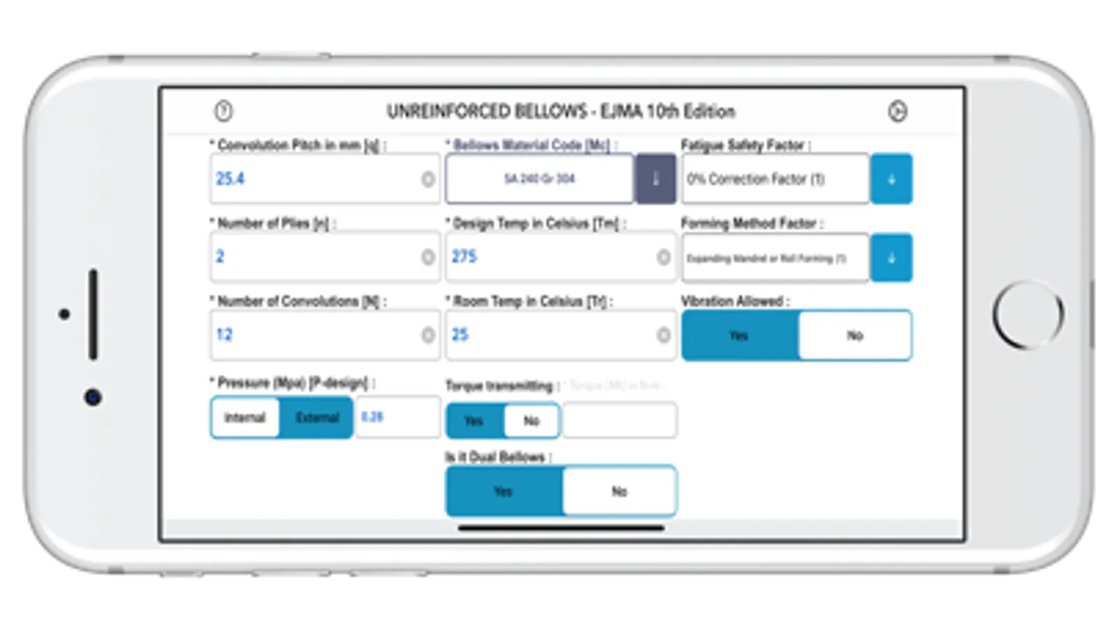 Calculations include Single, Dual Bellows with over a long list of Materials.