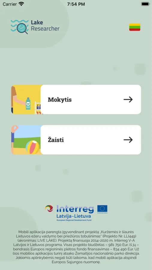 Mobili aplikacija parengta įgyvendinant projektą „Kuržemės ir Šiaurės Lietuvos ežerų valdymo bei priežiūros tobulinimas“ (Projekto nr. LLI449) (akronimas: LIVE LAKE). Projektą finansuoja 2014-2020 m. Interreg V-A Latvijos ir Lietuvos programa. Visas projekto biudžetas – 981 750 Eur, iš jų – bendrasis Europos regioninės plėtros fondo finansavimas – 834 490 Eur. Už šios mobiliosios aplikacijos turinį atsako Žemaitijos nacionalinio parko direkcija. Jokiomis aplinkybėmis negali būti laikoma, kad mobili aplikacija atspindi Europos Sąjungos nuomonę.
