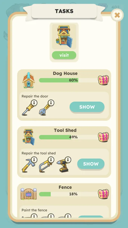 Unlock Puppy Town, where you find your home and look after the neighborhood. Restore your dog house, clean up the yard and get access to new features and functionality.
