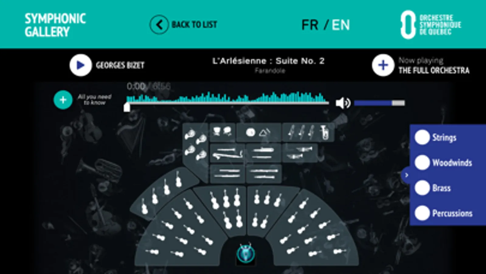 Explore and move your cursor among the different instruments on the screen, then go back to the full orchestra at any time, with the touch of a finger.