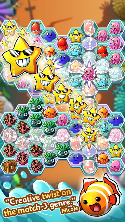 The best match 3 experience you'll have. Ocean Blast's unique hexagonal board is both challenging and fun. Swipe the fish to create awesome chain reactions to beat all levels. Bubblesome bosses are waiting for you.
