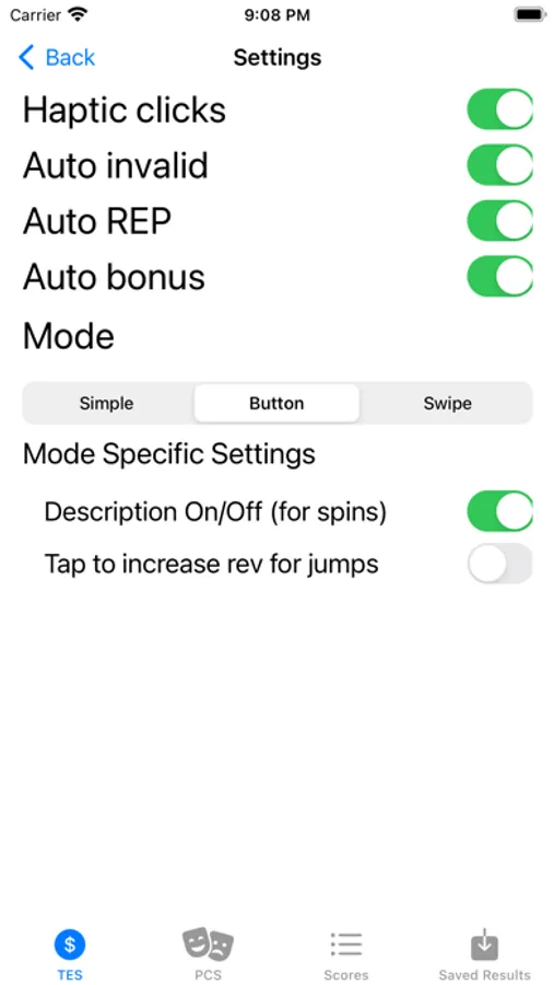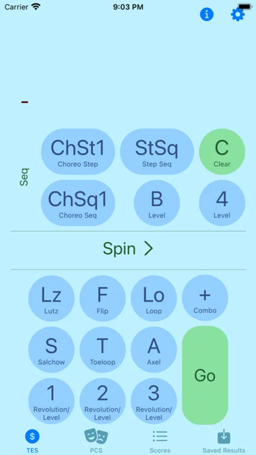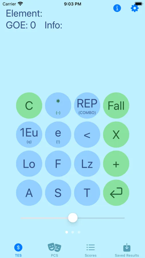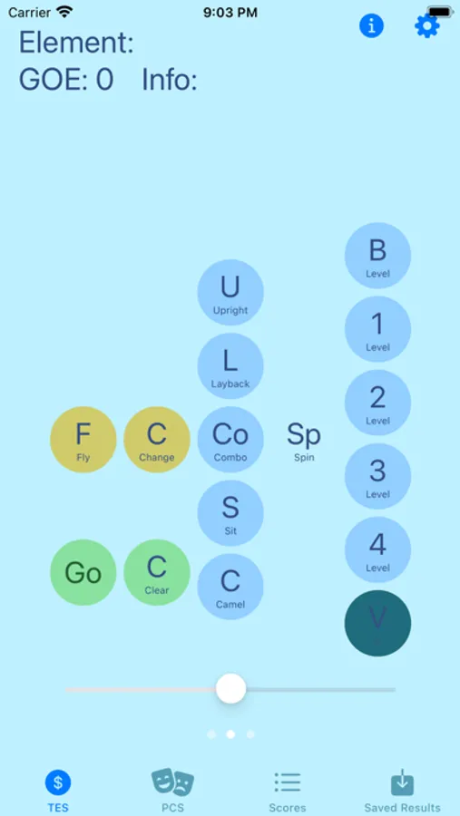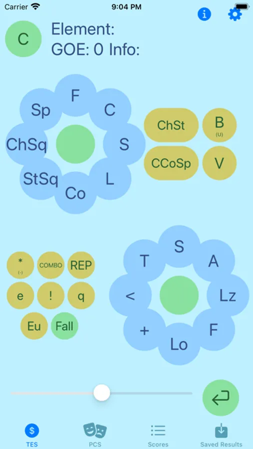 - Button mode. This mode has the full functionality of the IJS system. With this mode, you can enter every possible key and GOE that can be found in competitions. Three pages can be swiped through to find the jump section, the spin section, and the sequence section.
