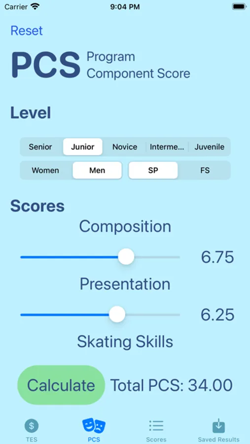 - Score Skates uses the new, three-part PCS system. The slider allows the user to enter each mark from 0 to 10 in increments of 0.25. The total PCS score is also calculated based on the user input's level, gender, and segment.