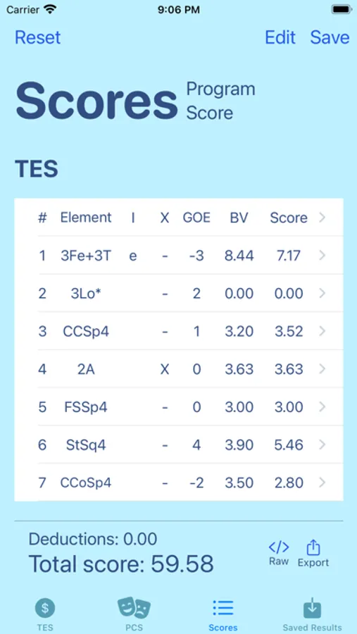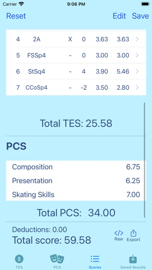 - The protocol shows the TES total, PCS total, deductions, and segment total.