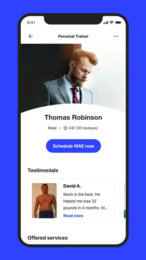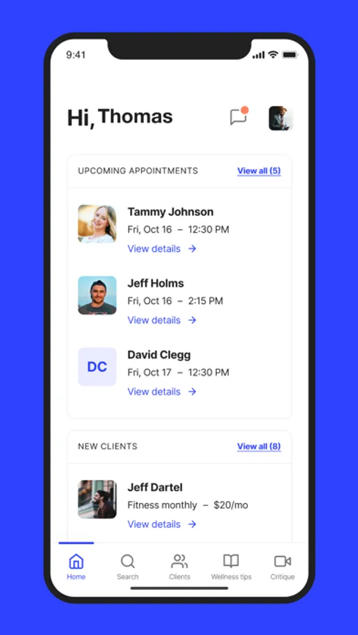 Whealth - Using Whealthconnect app, customers can search for physical or mental professionals, and seek 1-on-1 sessions for improving their health.  Customers can use assessment screens for see if they reach their goals.   Pros can setup their account, create profiles, upload appealing videos and manage their availability.  Customers can view videos, schedule appointments, pay and chat with Pros.  Intuitive workflows navigate the user screens based on prior selections. Facilities can onboard Pros and increase their value.