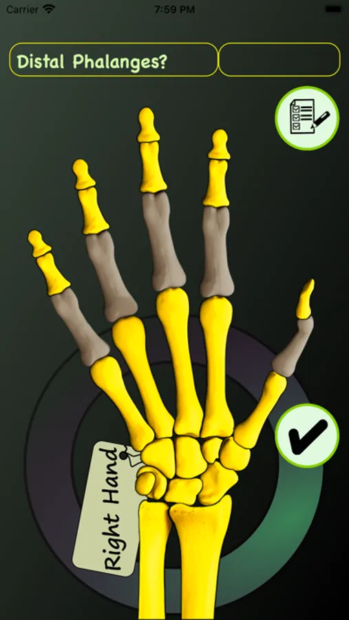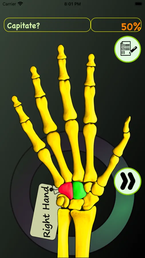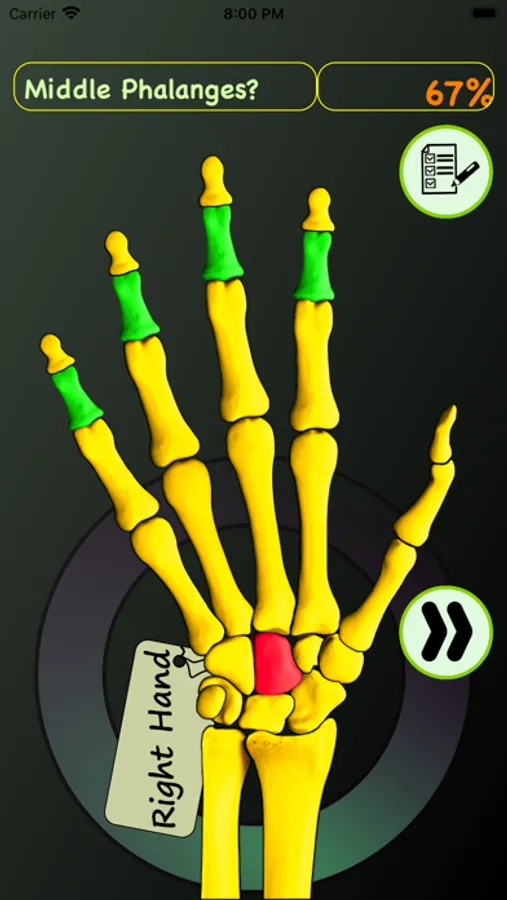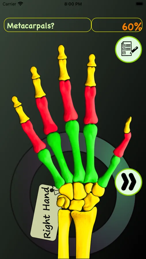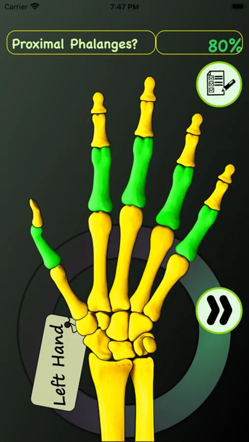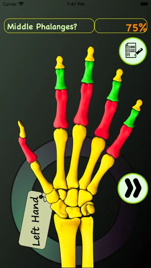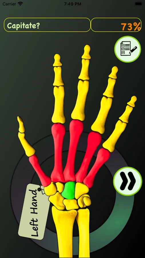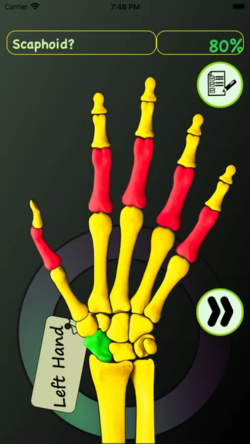 In quiz mode you are asked to select the specific bones. Overall score is displayed in percentage. The goal is to keep it over 80% at all times.