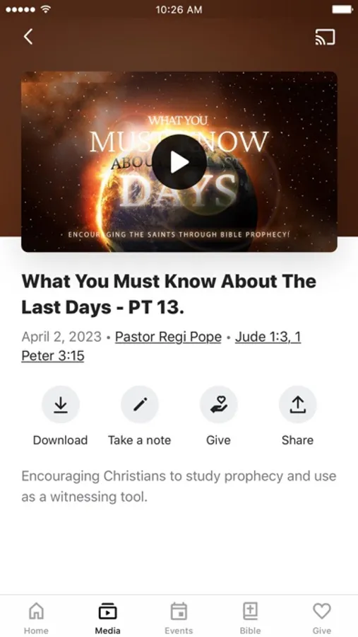 This app will help you stay connected with the day-to-day life of our church. You can: watch or listen to past messages; stay up to date with push notifications; share your favorite messages via Twitter, Facebook, or email; and download messages for offline listening.