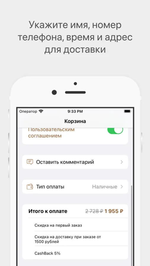 Укажите время, когда хотите прийти за своим заказом или выберите доставку с указанием времени и адреса доставки.
