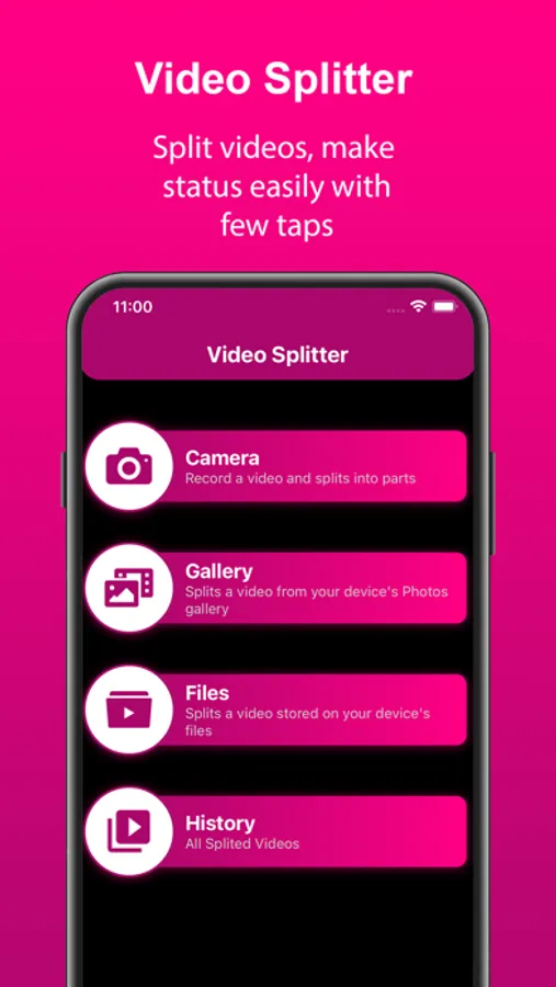 Post WhatsApp status videos with a length of more than 30 seconds. Share long videos on status with a single tap. It runs faster and the output video is perfectly trimmed with no frame freeze. Video splitter has other features like save history of your work, etc.