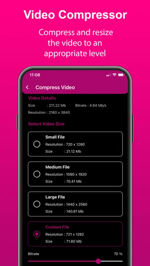 4. Custom file - compress the video with Custom bitrate and resize video to an appropriate level