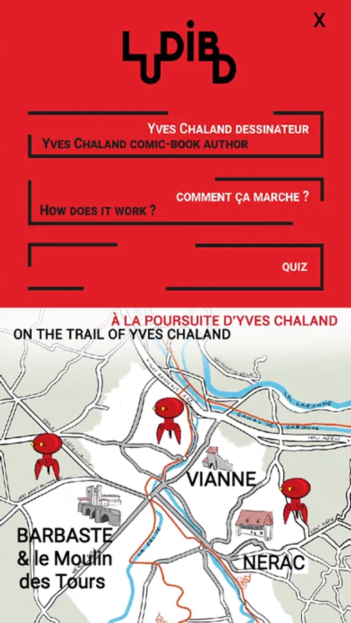 LudiBD - A la poursuite d'Yves Chaland est une balade interactive à ciel ouvert produite par Les Amis d'Yves Chaland pour découvrir un auteur de bande dessinée. Le parcours propose 12 œuvres d'Yves Chaland 2D et 3D animées en Réalité Augmentée.