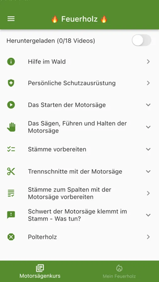 • Mit kurzen Videos, mit Bildern, Checklisten und Tipps wird das Sägen mit der Motorsäge am liegenden Stamm erklärt. Dieser Teil der App ist auch ohne Internet im Wald jederzeit im Smartphone griffbereit vollumfänglich nutzbar