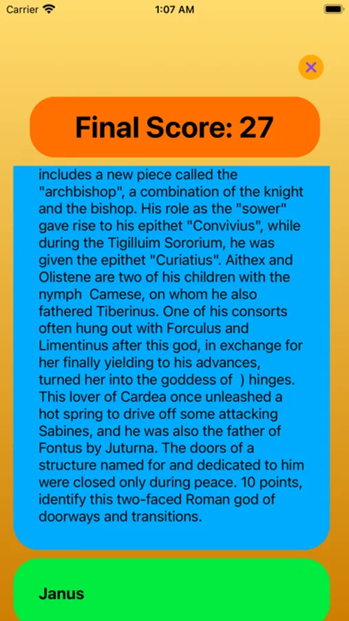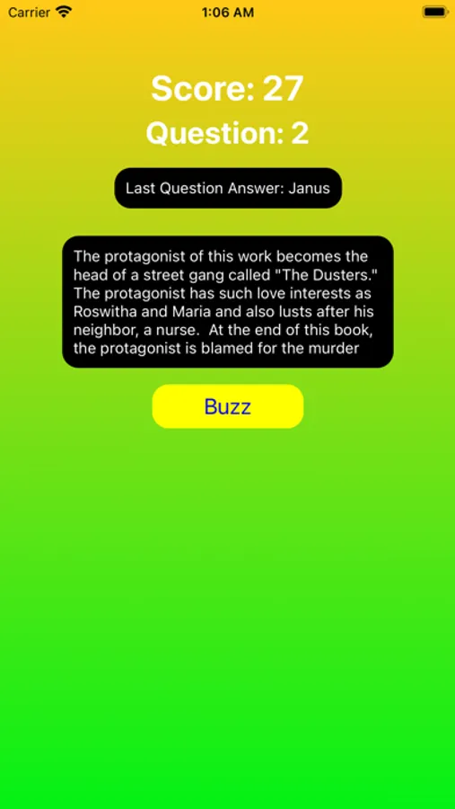 This is a trivia app to help quizbowl players harness their craft and practice. The question is read to users the same way it is in quizbowl rooms and the speed can be changed. Users can also read the question as it shows up. A user can set the difficulty of the question and see the correct answers after it passes. Answering more quickly is rewarded similarly to how quizbowl works. We are so excited to bring this app to you and are eager to hear feedback.
