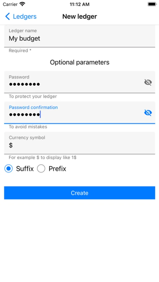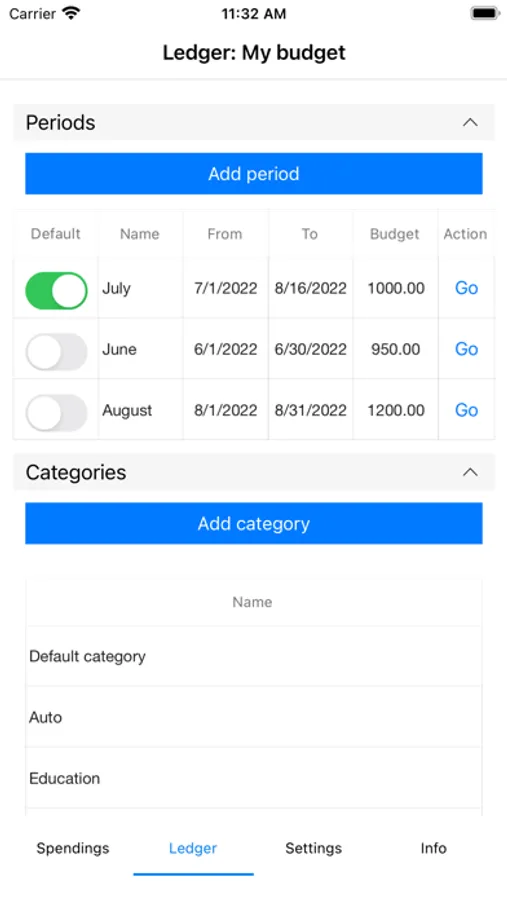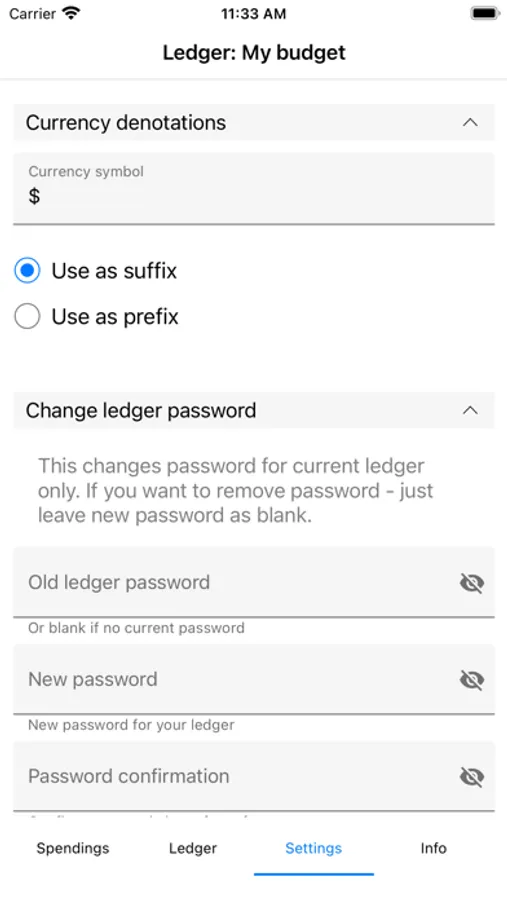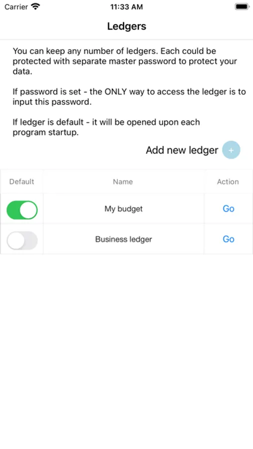 Application stores data in encrypted local database and does not need internet connection, since everything is stored on your device. It allows you to keep multiple separate databases called ‚ledgers‘ and each ledger can store unlimited number of periods.