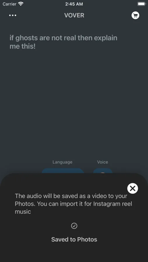 + Save as a Video so You can import it to Instagram Reel (Instagram App → REEL → Music → Import → select the video made by VOVER)