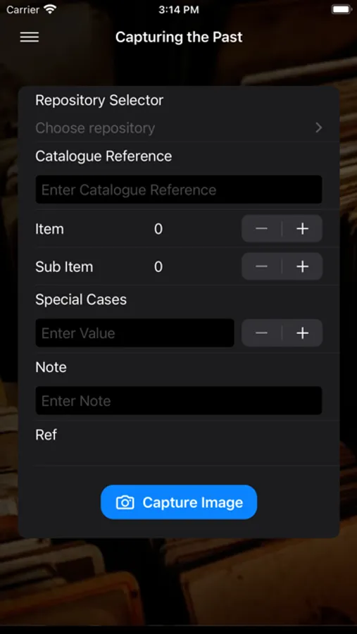 The purpose of the Capturing the Past phone app is to apply consistent machine readable file naming to photographs of historic documents and log the capture process in a comma separated value file to support the users of those photos. The app uses the device’s camera and saves photos with catalogue reference information included in the filename.